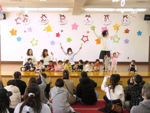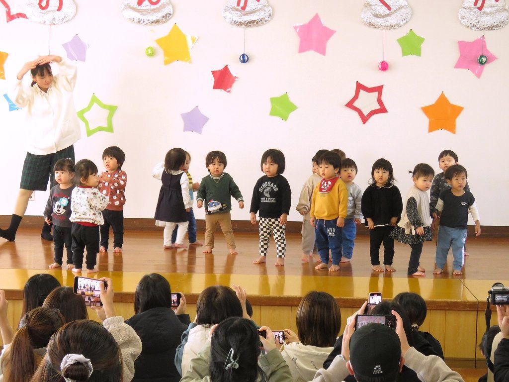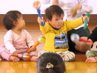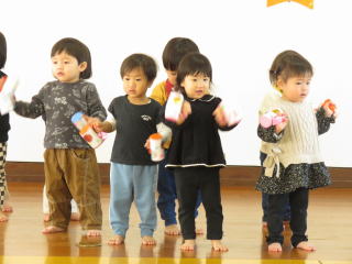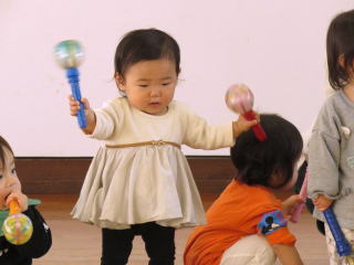 0歳児すみれ組・1歳児ゆり組さんは音楽に合わせて体を動かしたり、マラカスを降って踊ったりと楽しそうでした。
