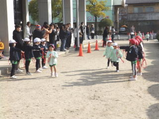 短い距離ですが2歳児さんにとっては運動会の何倍もの距離ですから大変です。途中から走るのを止める子もいて先生も大変です。
