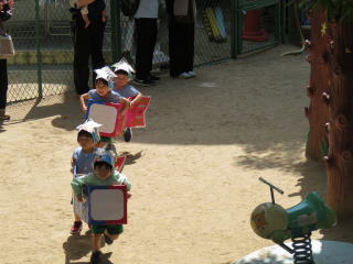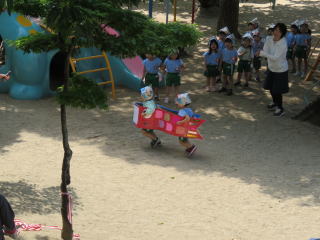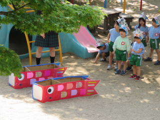 3歳児大きなこいのぼりの箱汽車を2人でおよがせながら走ります。こいのぼりの側面には一人一人の手形が押されたうろこを貼り付けました。大きいのでこいのぼりはあっちへ、こっちへ・・・。、