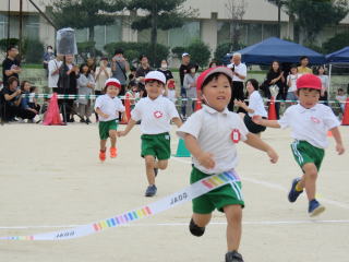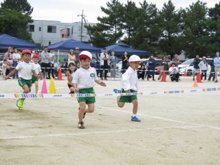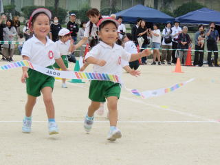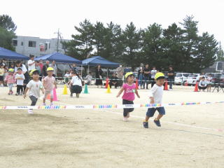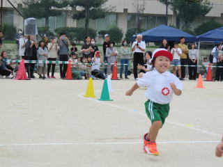 ゆったりとした空気を感じる3歳児のかけっこです。