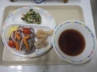 今回はいつものように大きい桶でそうめんを飾るのではなく、飾られた桶のそうめんを見ながら自分のお皿に七夕そうめんを作って・・・・・という企画だったのですが、きざみ海苔が場所を取っていたせいか、自分の皿に改めて盛るのが面倒くさかったのか、ほとんどの子がダイレクトにそうめんを取ってつゆに入れて食べてしまいました。もっと子どもの皿に大きく空いたスペースをつくった出し方をすればうまく行ったのかもしれませんが、今回は完全に給食課の完敗でした。
