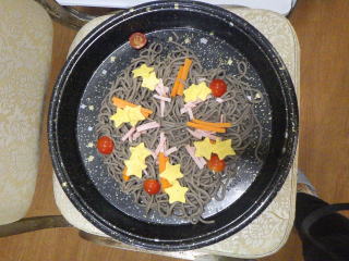 彼はそばアレルギーがあるので残念ながらピースご飯とからあげ他の、特別メニューが提供されました。