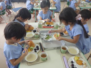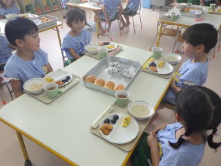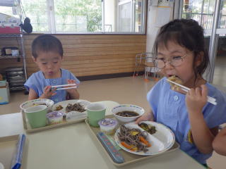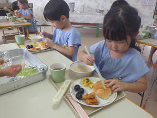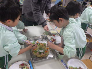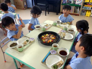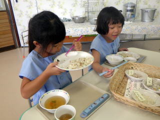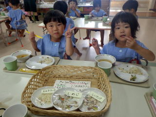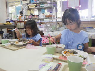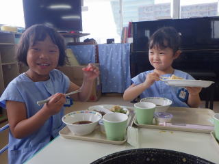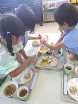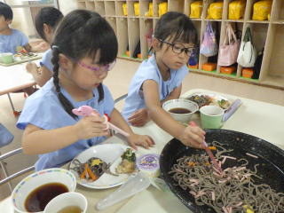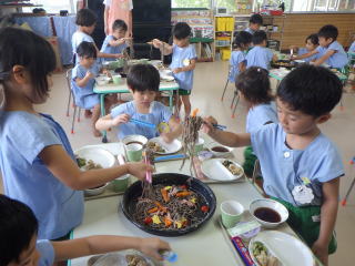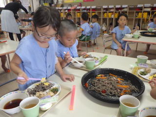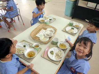 先月のそうめんで子ども達がダイレクトに食してしまった反省から、今回はしっかりと給食課からレクチャーがあり、みんな真剣に自分のお皿に盛り付けていました。