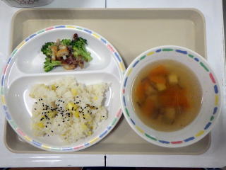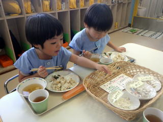 給食の時に出されたピースご飯を見ながら、自分達で皮をむいた実感を感じたのか、なんだか誇らしげでした。