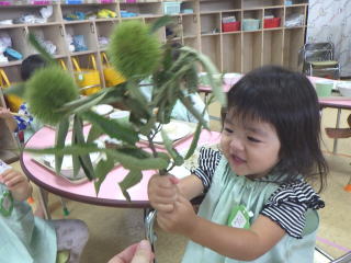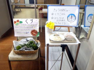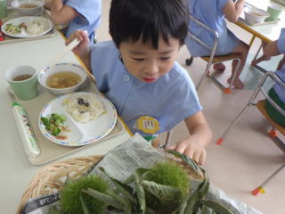 給食課がイガのついた栗を展示後、各クラスに見せてまわりました。初めて見る子も多く、恐る恐るイガを触ってはお店で売っている栗がイガの中にあることにびっくりしていました。