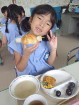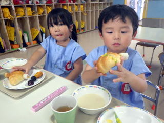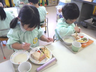 4月のスペシャルランチは、進級して約1カ月過ぎだいぶクラスも落ち着いて来ましたので、給食課から今年もスペシャルランチをよろしくとのことで、アンパンマンのパンとハートのコロッケ、サラダ、トマトシチューが出されました。子ども達はアンパンマンのパンに大喜びでした。