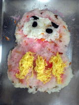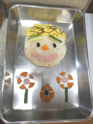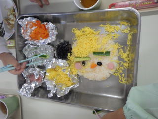 錦糸卵やきゅうり、ソーセージ、にんじん、黒豆他でスマイルなお顔を作ってもらいました。完成後は自分のお皿に小さなスマイルのお顔を作りました。