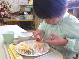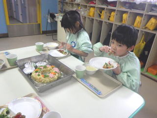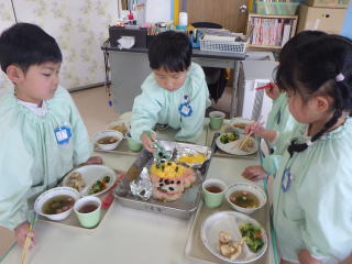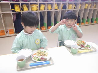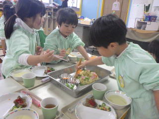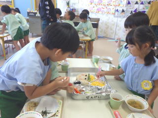 みんなで作るシリーズのスペシャルランチのスタートです。4・5歳児さんは経験がありますが、3歳児さんは初めての経験で、どうやるのか担任や給食課の先生がつきっきりで指導していました。