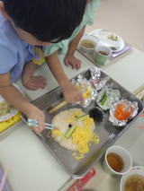 ウィンナーやトマト、フライドポテト、ソーセージ等が用意され、子ども達はお好みの顔に仕上げていきました。