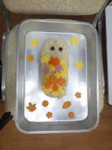 秋の気配が感じられる時期になり、秋を表現させたいという給食課の願いでしたが、今回はうまくいきませんでした。なぜならば、絵本等で子ども達が見ることはあるものの、本物のみのむしを見たことのない子がほとんどだったからです。そういえばめっきり目にすることがなくなりました。