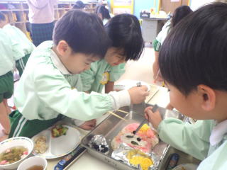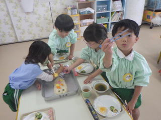 ポイントは錦糸卵ときゅうりの使い方で、ハの字にすると困った顔、逆ハの字にすると怒った顔になることを発見したようで、みんなであっちに向けたりこっちに向けたりと、スマイルライスの表情を変えて楽しんでいました。