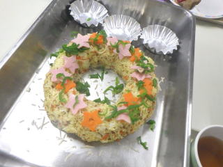 ドーナツ状のドライカレーライスの上にリースの飾り付けをしました。星型のハムや人参他で思い思いのリースを作りました。