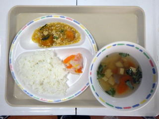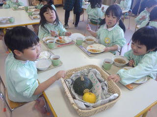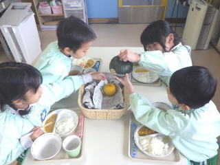 いつも通りの事ですが、各テーブルに回るのでさわったりにおいを嗅いだりしていました。当然給食にはかぼちゃの煮つけが出されました。