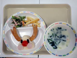 12月になりクリスマスも近づいたので、三角おむすびをトナカイの顔に見立ててつくってもらいました。